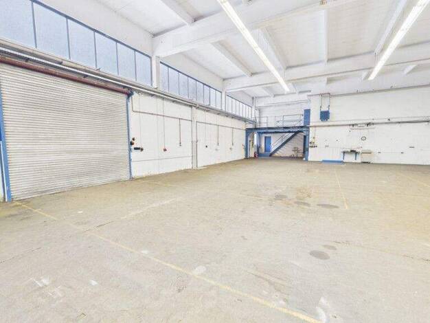 Diese ca. 1.418 qm große Halle mit großem Rolltor, Lastenaufzug und Krananlage besitzt zudem eine eigene LKW-Zufahrt und bietet Platz für ca. 10 Außen-Kfz-Stellplätze. Eine kameraüberwachte Alarmanla...