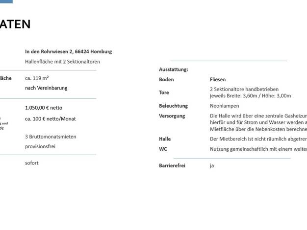 Nahe zur Autobahn A 620 (St. Arnualer Kreisel) gelegene und ohne Nachbarn befindliche Hallenfläche; ca. 500 m² groß plus ca. 75 m² Büro und ca. 75 m² Sozial; etwas Freifläche plus ausreichende Parkmö...