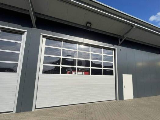 Hohe, gedämmte Gewerbe-/ Lagerhalle mit 14 m Höhe und großer Aussenfläche - ebenerdige Zufahrt mit Sektionaltor - Pultdach Höhe: 14 m auslaufend auf 5 m - Sektionaltor: ca. 400 x 400 cm - 2022 neue L...