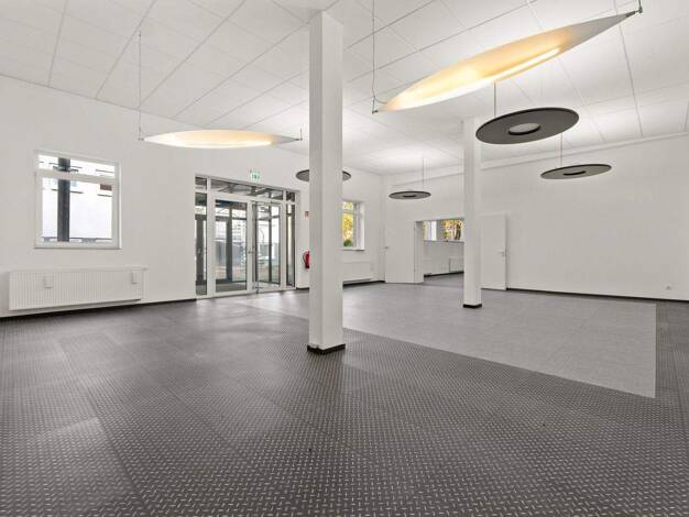 Vielseitig nutzbare Hallenflächen zur Lagerung, Produktion, Ausstellung oder sonstigen Zwecken. Büro- und Sozialflächen sowie Stellplätze sind vorhanden.