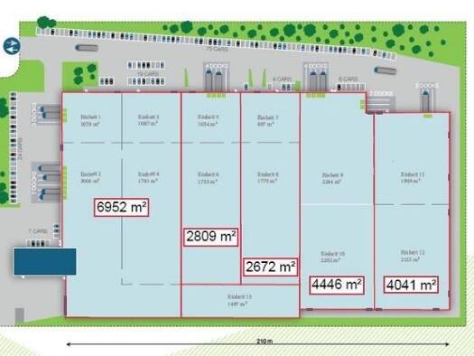 Das hier vorgestellte Objekt teilt sich in 6 Hallen (7.979 m²) die miteinander verbunden sind und ein Büro (596 m²). Die Hallen sind so angelegt, dass man von 2 Seiten be-/entladen kann. Die Büros si...