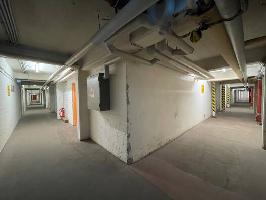 Die Lagerflächen befinden sich im Untergeschoss eine Gewerbehauses. In den oberen Geschossen befindet sich ein bekannter Elektronikhändler.