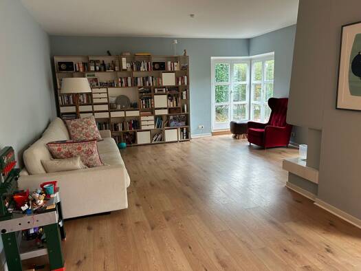 Im EG-Bereich befinden sich folgende Räume: großes Wohnzimmer - ca. 30 m² mit off. Kamin und Zugang zur Terrasse in SW-Lage, eine Diele, eine Küche, ein Schlafzimmer - ca. 20 m² groß sowie ein modern...