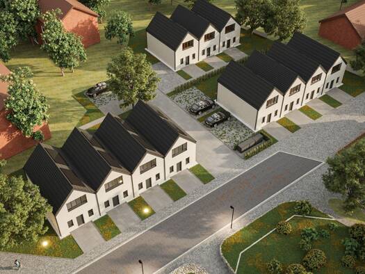 Dieses Neubau-Reihenhaus ist auf ca. 75m² Wohnfläche in drei Zimmer aufgeteilt. Über den Eingangsbereich gelangt man in den Flur, von dem alle Räume im Erdgeschoss zu erreichen sind. Der großzügige W...