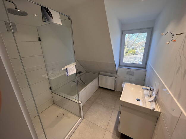 Neubau mit Wärmepumpe, Fußbodenheizung, kontrolierte Belüftungsanlage, dreifach Verglasung, Terrasse mit Gartenanteil, weiße Einbauküche, Gäste-WC, Vollbad mit Wanne und Dusche und Fenster im 1. OG, ...