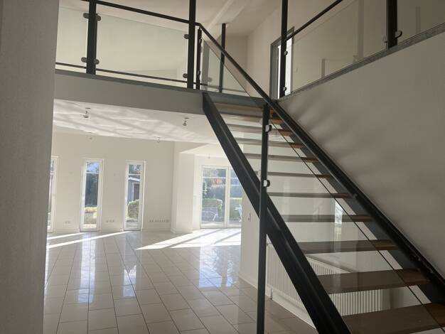 Das Haus befindet sich im Norden Flensburgs. Im Erdgeschoss befindet sich ein Wohnbereich mit offener Küche, dahinter grenzt ein HWR. Oben an der Treppe ist eine kleine Galerie sowie ein Schlafzimmer...