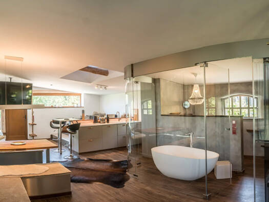 Dieses außergewöhnliche Loft verbindet moderne Architektur mit natürlicher Bauweise und schafft ein einzigartiges Wohnambiente für Menschen, die Wert auf Design, Ruhe und Qualität legen. Die offene R...