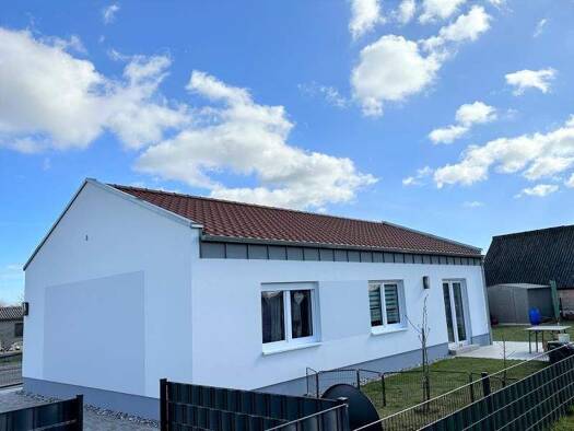 Objekt - Einfamilienhaus im Bungalowstil - Baujahr 2022 - eingeschossig - lichtdurchflutet - Kunststofffenster, weiß, 3-Fachverglasung und Einhand-Dreh/Kipp-Beschlag - Rollläden an allen Fenstern und...