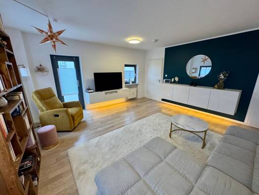 Im Erdgeschoss führt Sie das Entree vorbei am Gäste-WC und dem Abstellraum zur Garderobe direkt unter dem Treppenaufgang. Nur wenige Schritte weiter hinein in den lichtdurchfluteten Wohnbereich mit o...