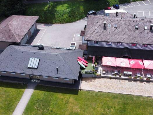 Auf dem über 3.000 m² großen, terrassenartigen Hanggrundstück befindet sich das Gaststättengebäude, ein architektonisches Highlight mit Panoramaverglasung. Dem Objekt vorgelagert sind ausreichend Par...