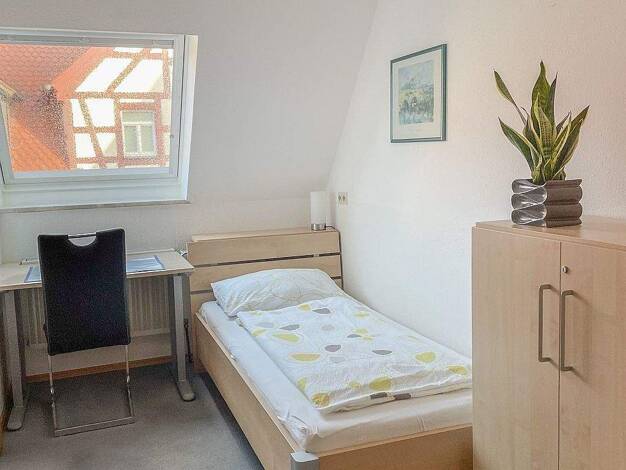 Helles, freundlich möbliertes WG-Zimmer in einer 4-Zimmer-Wohnung im 1. OG eines Zweifamilienhauses im Norden Nürnbergs/Heroldsberg. Das Zimmer verfügt über ein Einzelbett, Schreibtisch mit Stuhl, ein Waschbecken und einen Kleiderschrank. Bettwäsche wird vom Vermieter kostenlos gestellt. Die voll eingerichtete, gemeinsame Wohnküche ist ausgestattet mit allen Utensilien des täglichen Bedarfs wie Geschirr, Geschirrspüler, Herd, Mikrowelle etc. Hier befindet sich ein Fernseher sowie ein Radio zur ...
