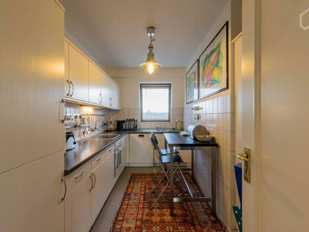 The room is 16 square meters in size and particularly bright. The room is equipped with a king-sized bed with fine bedding as well as one bedside tables, and a large closet. In addition to your own room, you and your flat-mate share a spacious and charming kitchen with a seating area. Moreover, the kitchen is fully fitted with cooking equipment and utensils. Furthermore, the spacious bathroom has a modern shower and there is also a washing machine in the apartment.