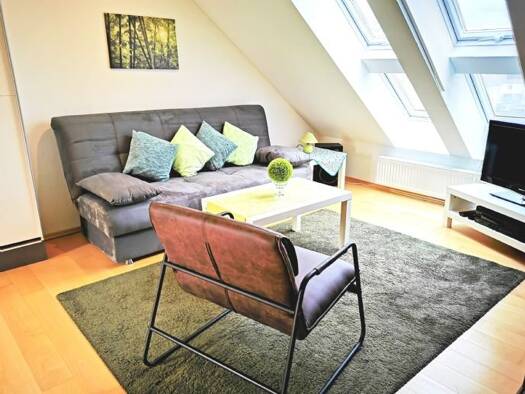 Attraktive, atriumartige helle und ruhige Dachgeschoss Wohnung mit integriertem Küchenbereich, Ess- und Arbeitsplatz, sowie Sofa mit Sitzgruppe. Kleiner separater Schlafraum mit Doppelbett und Duschbad mit WC und Waschbecken. Die komplette Wohnung, auch das Bad, ist mit Parkett ausgelegt und modern möbliert (die Grundfläche ist deutlich größer, da Schrägen). Gartennutzung möglich. PKW-Stellplatz vorhanden. Klimaanlage. Eine 14-tägige Reinigung WLAN und alle Nebenkosten sind enthalten. Die Wohnu...