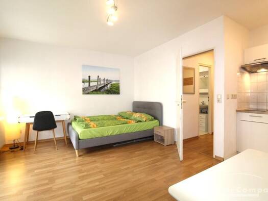 . Zur Vermietung steht eine möblierte 1 Zimmer Wohnung mit einem 140cm x 200cm Bett, einem Schreibtisch, einem Schuhschrank, einen Kleiderschrank, eine Kommode, einem Badunterschrank, ein Esstisch un...