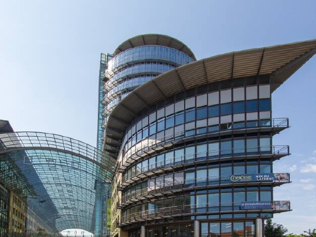 Mit seiner harmonischen und leichten Architektur überzeugt das Geschäftshaus Mitte den Betrachter auf den ersten Blick. Die Natursteinfassade in Kombination mit den farbigen, charakteristischen Putzf...
