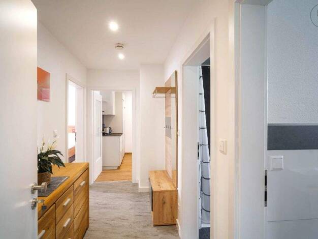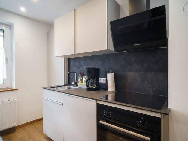 Das Apartment ist modern ausgestattet mit einer kleinen Sitzecke, TV, einem Bartisch und 2 Barhockern, einem Bett (140 cm) mit Stauraum, einem Schrank, einer kleinen Küchenzeile und im Eingangsbereic...