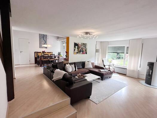 Die bezaubernde Haushälfte (140 qm) mit großem Garten gliedert sich im licht-durchfluteten Erdgeschoß in Diele, ein Gäste-WC, die Küche, ein Abstellraum, in den Ess- und Wohnbereich mit großem Panora...