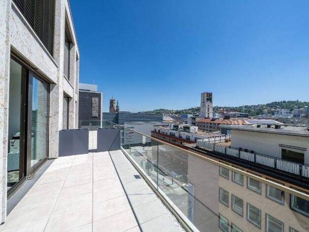 In begehrter Lage von Stuttgart-Hofen erwartet Sie eine außergewöhnlich stilvolle Wohnung mit ca. 85 m² Wohnfläche und beeindruckender Sonnenterrasse. Das Herzstück der Wohnung bildet das weitläufige, lichtdurchflutete Wohn- und Esszimmer mit großer Fensterfront und direktem Zugang zur großzügigen Terrasse. Die offene Raumgestaltung sowie die helle Atmosphäre schaffen ein repräsentatives und zugleich einladendes Ambiente. Der Wohnbereich ist mit einem hochwertigen Ledersofa, einem neuen Teppich...