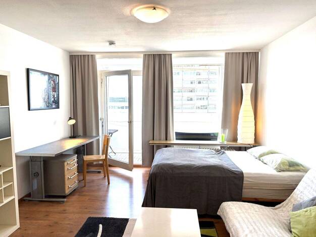 Weitere Informationen, viele hochauflösende Fotos und ein Video zu diesem Objekt finden Sie unter: https://www.mrlodge.de/wohnungen/detailansicht/11028/ See offer in English: https://www.mrlodge.com/search/detailed-view/11028/ Zimmer: Kombiniertes Wohn-/Schlafzimmer:, Doppelbett 140 x 200 cm, Esstisch mit 2 Stühlen, Sofa, Bad mit Badewanne Bodenbelag: Parkettboden, Fliesenboden Möblierung: 1-3 Jahre, schön und hell eingerichtet, gut Küche: kleine Einbauküche, mit Fenster, Cerankochfeld, Dunstab...