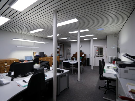 Die Halle gliedert sich in einen vorderen Bürobereich und einen hinteren Lagerbereich. Die Büros sind flexibel nutzbar; links liegt das Hauptbüro, rechts ein großer Schulungs- oder Besprechungsraum. ...