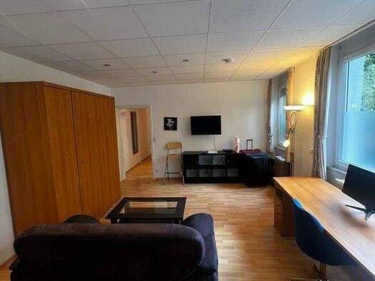 Ideal zum Hauptbahnhof: Schön möbliertes 1-Zimmer-Apartment mit WLAN in Nürnberg/Steinbühl. Die Möblierung des Zimmers besteht aus 2 Einzelbetten, die man als Doppelbett nutzen kann (2x 0,90x2,00 m), Nachttisch, Flatscreen TV, ausziehbare Schlafcouch, Hocker, Couchtisch sowie einem Schreibtisch mit Stuhl. Die separate Küche ist mit allen Utensilien des täglichen Bedarfs ausgestattet wie Herd, Backofen, Kochutensilien, freihstehendem Kühlschrank, Kaffeemaschine, Wasserkocher etc. Ein Hochtisch m...