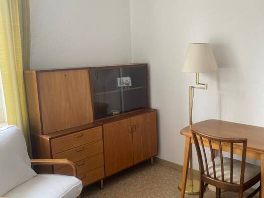 Das Apartment besteht aus einem Zimmer mit Küchenzeile sowie einem extra Tageslicht-Bad. Das Zimmer ist u.a. mit einem Bett, einem Schrank, einem Tisch und Stühlen möbliert. Die Küche besteht aus einem Kühlschrank mit Gefrierfach, einer Spüle und einer Elektro-Herdplatte sowie Oberschränken. Besteck, Geschirr, Wasserkocher u.ä. ist ebenfalls vorhanden. Das kleine Tageslichtbad verfügt über eine Dusche, ein Waschbecken und ein WC. Die Wohnung hat KEINEN Balkon und KEINEN zusätzlichen Lagerraum. ...