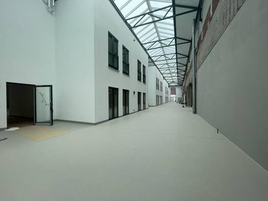Die Bürofläche befindet sich im Erdgeschoschoss eines zweigeschossigen Anbaus. Hier stehen insgesamt drei lichtdurchflutete Büroräume mit bodentiefen Fenstern, und eine Innenterrasse zur Verfügung. ...