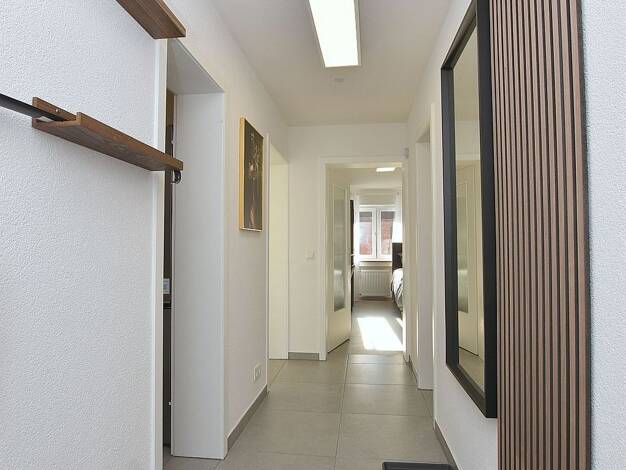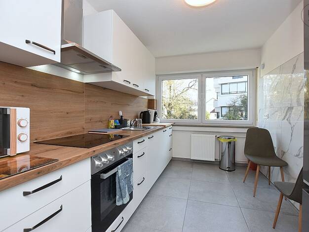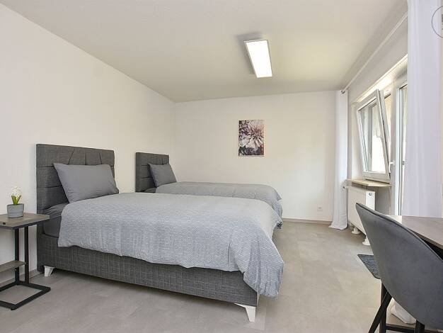 Neu renovierte sowie neu und modern möblierte 3-Zimmer Wohnung mit zwei Balkonen, Internet und Garagenstellplatz in ruhiger Wohnlage in Schorndorf. Der Ortskern mit allen Einkaufsmöglichkeiten, Restaurants, Banken, Ärzten etc. sowie die öffentlichen Verkehrsmittel sind in 10 bis 15 Gehminuten erreichbar. AUFTEILUNG: - Wohn- und Essbereich mit großer Fensterfront und Zugang zum Balkon, möbliert mit zwei Schlafsofas, Tisch mit vier Stühlen, Lowboard und Smart TV - Schlafzimmer mit zwei Einzelbett...