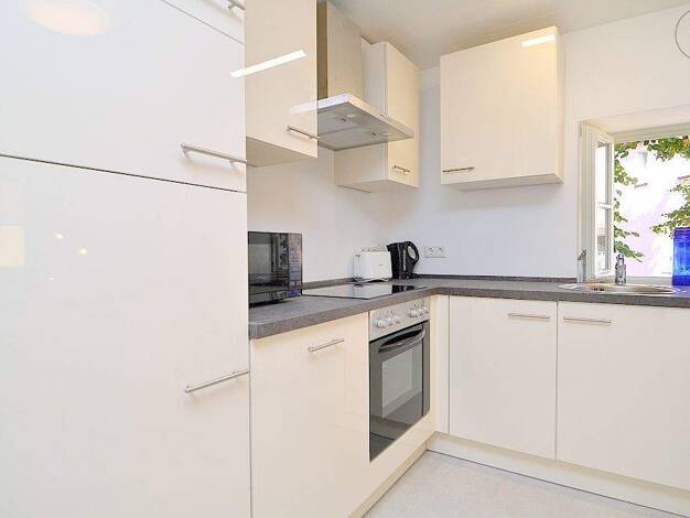 Kernsanierte und schön möblierte 2-Zimmer-Maisonettewohnung mit WLAN und Vinyl Designbelag ruhig gelegen in einem Wohngebiet nur wenige Gehminuten in die Altstadt Lauf-a.-d.-Pegnitz, östlich von Nürnberg. Die Möblierung des Wohnzimmers besteht aus einer ausziehbaren Schlafcouch, Couchtisch, Lowboard, Flatscreen TV, Lowboard sowie einem Esstisch mit 3 Stühlen. Die offene, moderne Einbauküche ist mit allen Utensilien des täglichen Bedarfs ausgestattet wie Cerankochfeld mit Dunstabzug, Backofen, G...