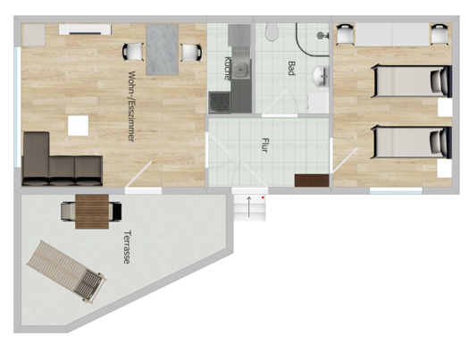 großzügige 2-Zimmer-Wohnung in Oberboihingen, ca. 75 m², Wohn-Ess-Schlafbereich mit Küche, Essplatz, 2 Einzelbetten, Terrasse, TV, WLAN; Vorraum mit Couch und kleinem Schlafraum mit Einzelbett und Sc...