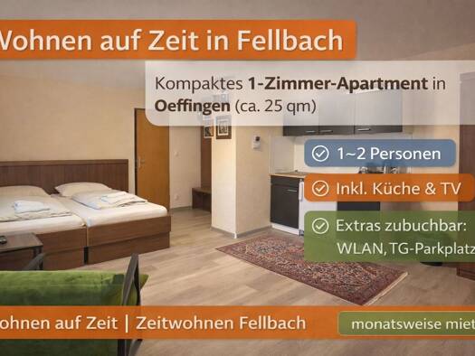 Wohnen auf Zeit in Fellbach - 1-Zimmer-Apartment für 1-2 Personen Dieses 1-Zimmer-Apartment in Fellbach-Oeffingen ist für Menschen gedacht, die für einen begrenzten Zeitraum ein ruhiges, funktionales und komplett nutzbares Apartment suchen. Kein Hotelzimmer, sondern eine kleine Wohnung, in der man ankommt, wohnt und den Alltag gut organisieren kann. Das Apartment befindet sich in einem Gästehaus mit insgesamt 24 Einheiten, das überwiegend von Zeitmietern genutzt wird. Das Apartment ist für eine...