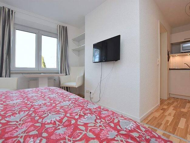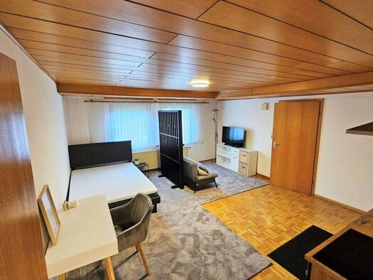 Die gemütliche Einliegerwohnung überzeugt durch ihre helle und freundliche Atmosphäre. Beim Betreten fällt sofort das großzügige Wohnzimmer ins Auge, das gleichzeitig als Schlafbereich dient. Der Rau...