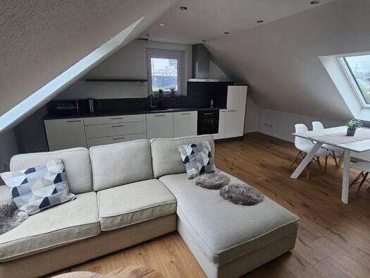 Sehr schön möblierte 1,5-Zimmer Maisonette-Wohnung mit großem Balkon und eigenem Garagenstellplatz in Stuttgart Vaihingen. AUFTEILUNG: - Wohn- und Essbereich mit großer Fensterfront, möbliert mit Sofa, Lowboard, Smart-TV, Vitrine sowie einem Esstisch mit drei Stühlen - Schlafzimmer im oberen Bereich mit Französischem Boxspringbett (120x200), großem Kleiderschrank, Schreibtisch (zwischenzeitlich durch einen neuen, höhenverstellbaren ersetzt) und Stuhl (Laptop wird nicht mitvermietet) sowie Zugan...