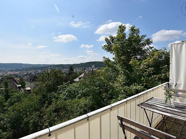 Wunderschöne, sonnige 4-Zimmer Wohnung mit tollem Ausblick über Stuttgart in beliebter Höhenlage in Stuttgart West. Die Wohnung ist auch gut für zwei Kollegen oder eine Familie geeignet, da sie über zwei getrennte Schlafmöglichkeiten verfügt. Das lichtdurchflutete Wohnzimmer hat Zugang zum Balkon und ist mit einem Sofa, einem Couchtisch und einem Flat-TV möbliert. Im angrenzenden Esszimmer befinden sich ein großer Tisch mit Stühlen und ein Regal. Das Schlafzimmer ist mit einem Doppelbett und ei...