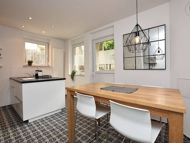 Wunderschöne, modern möblierte 2-Zimmer Wohnung in einem denkmalgeschützten, grundsanierten Haus in zentraler Lage in Stuttgart Weilimdorf. Einkaufsmöglichkeiten sowie die öffentlichen Verkehrsmittel befinden sich in fußläufiger Nähe. Das helle und großzügiges Wohn-Esszimmer ist mit einem Sofa, einem Couchtisch, einem Flat-TV, einem Tisch mit zwei Stühlen und einer Schrankwand ausgestattet. Das Schlafzimmer ist mit einem Französischen Bett (1,40x2,00m) und einem Shreibtisch mit Stuhl eingericht...