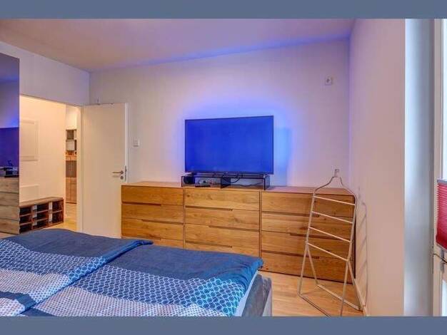 Schön geschnitten mit 2 Schlafzimmern, Wohnzimmer, Küche im Gang und Badezimmer. Die Schlafzimmer sind jeweils mit Bett (1x Doppelbett, 1x Einzelbett) und Kleiderschrank möbliert. Beide bieten prakti...