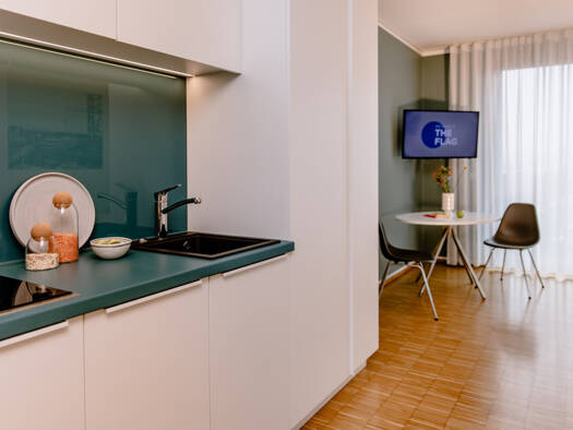 Möblietes Wohnen auf Zeit: Möbliertes Apartment in Moosach Küchenzeile mit Cerankochfeld, Mikrowelle, Nespresso-Maschine, Wasserkocher und Küchengrundausstattung Schlafbereich mit Bett 1,40 x 2,00 m....