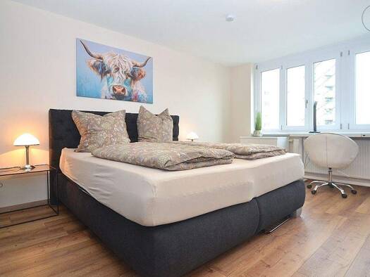 Ideal für Kollegen oder eine Familie: Gemütlich möblierte 4-Zimmer-Wohnung mit 3 Schlafzimmern, 2 Balkonen und Stellplatz mit spektakulärem Ausblick auf den Europakanal in Erlangen. Die Möblierung de...