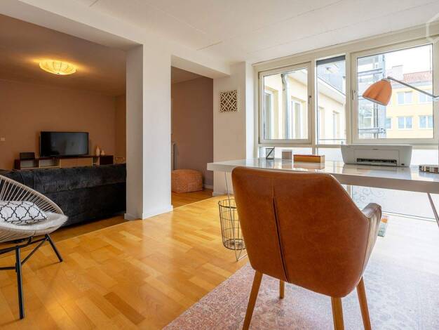 Exklusiv möblierte 2-Zimmer-Wohnung mit WLAN, Balkon in beliebter Lage der Nürnberger Altstadt. Im modernen Wohnzimmer befindet sich ein anthrazitfarbenes Schlafsofa, Sessel, Couchtisch, Sideboard mi...