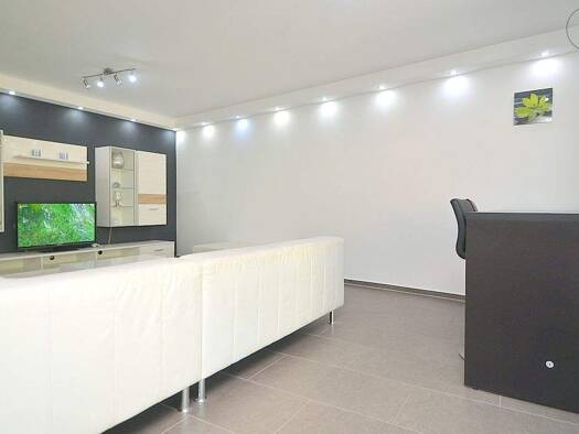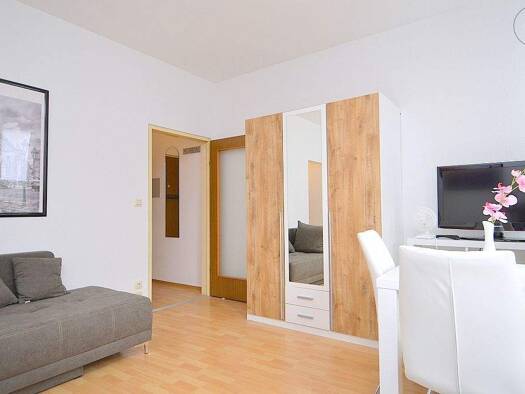 Empfehlenswert nahe Innenstadt: Modern möbliertes 1-Zimmer-Apartment mit WLAN in ruhiger und zentraler Lage am Nürnberger Plärrer, nur 5 Gehminuten in die Innenstadt. Die geschmackvolle Möblierung des Zimmers besteht aus einem Boxspringbett (1,20x2,00 m), Beistelltisch, 2-Sitzer-Couch in grau, Würfelregal mit Flatscreen TV, Kleiderschrank sowie einem Esstisch mit 2 Stühlen. Die offene und dennoch abgetrennte Einbauküche ist mit allen Utensilien des täglichen Bedarfs ausgestattet wie 2-Platten-C...