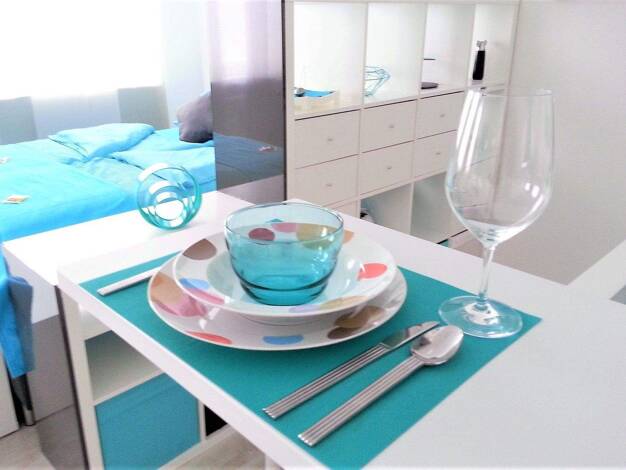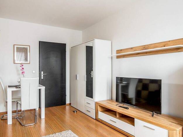 Schön möbliertes, helles 1-Zimmer-Apartment in Röthenbach bei Schweinau. Die Möblierung des mit Vinyl ausgelegten Zimmers besteht aus einer weißen Couch, Couchtisch, Flatscreen TV, Sideboard, Esstisc...