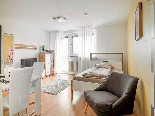 Sehr empfehlenswert: Modern und geschmackvoll möbliertes 1-Zimmer-Apartment mit WLAN und Balkon in zentraler und dennoch ruhiger Lage in Nürnberg/Galgenhof. Die Möblierung des Zimmers besteht aus einem breiteren Einzelbett mit praktischem Bettkasten (1,20x2,00 m), Beistelltisch, großen Sessel, Couchtisch, Lowboard mit Flatscreen TV, Kleiderschrank, Vitrine sowie einem Esstisch mit 2 Stühlen. Der angrenzende Balkon mit Tisch und Stuhl lädt zum Verweilen ein. Die Einbauküche, die vom Wohnraum abg...