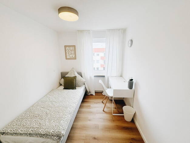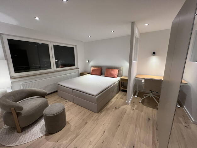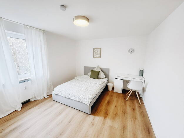 Diese vollständig möblierte 5-Zimmer-Wohnung bietet modernen Wohnkomfort in einem gepflegten und einladenden Ambiente - ideal für Studenten, Berufspendler oder Wohngemeinschaften. Wohn- und Schlafbereiche Jedes der fünf Zimmer ist komfortabel ausgestattet mit einem gemütlichen Bett, einem praktischen Schreibtisch mit Stuhl sowie einem geräumigen Kleiderschrank. Zimmer 3 verfügt zusätzlich über einen direkten Zugang zum Balkon, die zum Entspannen im Freien einlädt. Küche Die ausgestattete Küche ...