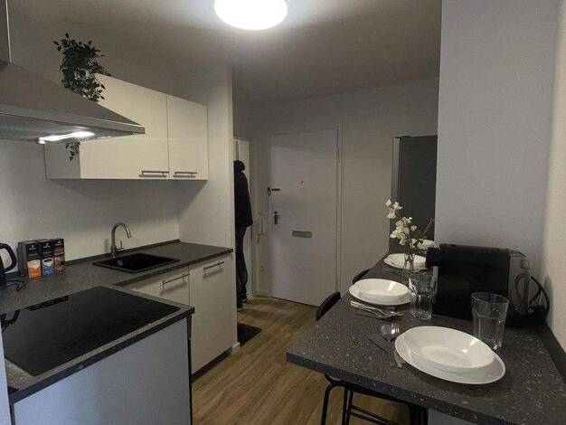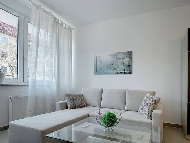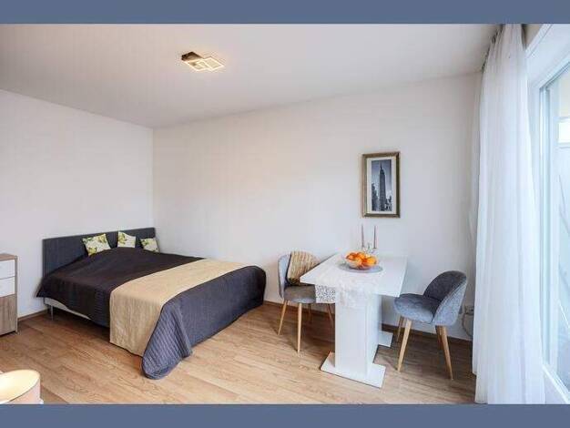 Ausstattung & Highlights: 2 Zimmer, Küche, innenliegendes Bad Voll möbliert und komplett ausgestattet Moderner Wohnstil, sehr helle Räume durch optimale Südausrichtung Offener Süd-Balkon mit weit...