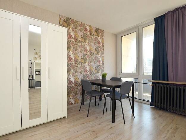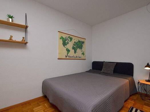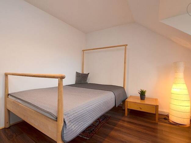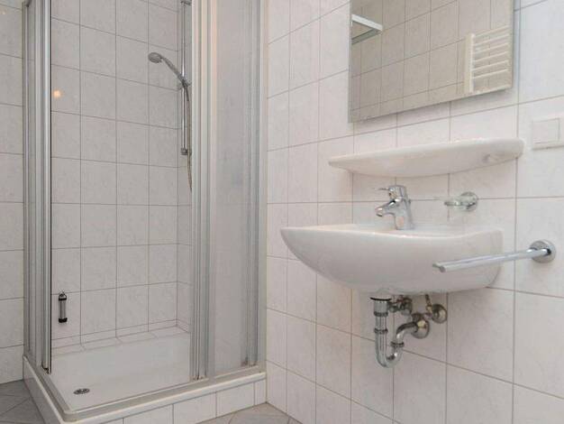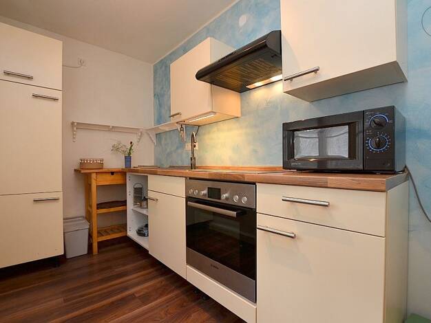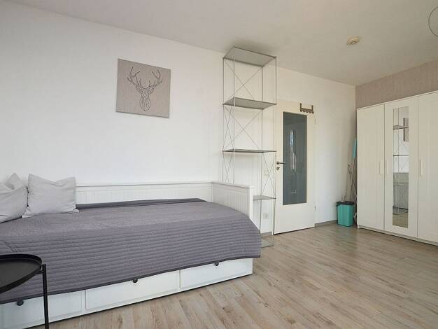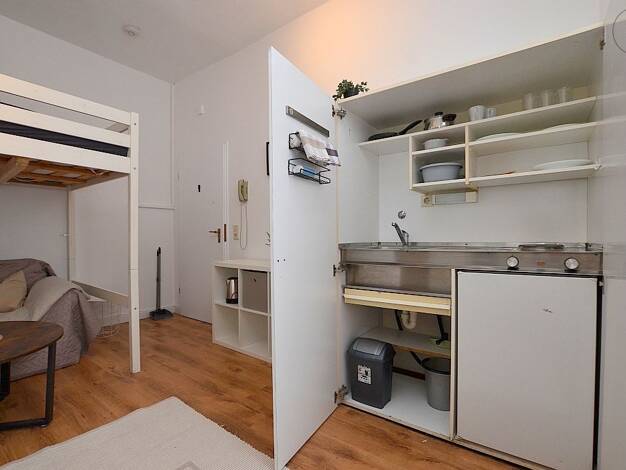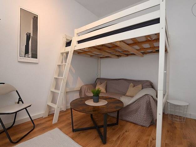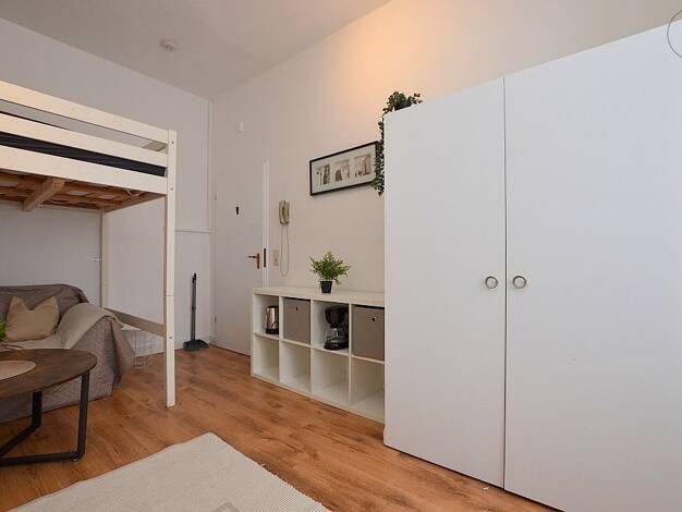 Hell möbliertes Apartment in der Würzburger City Das ca. 30m² große Apartment, welches mit Laminatboden ausgelegt ist, befindet sich im 3. Obergeschoss eines Mehrfamilienhauses. Der Wohn- und Schlafbereich ist mit einem Sofa mit Couchtisch, Hochbett mit einer 1,20m breiten Matratze, Kleiderschrank, Schreibtisch mit Bürostuhl, Stuhl und einer Kommode möbliert. Hinter einem weiteren Einbauschrank befindet sich die Singleküche, welche mit zwei Herdplatten, Kühlschrank, Kaffeemaschine, Wasserkocher...