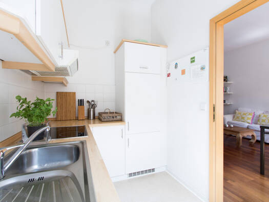 Hochwertig möblierte lichtdurchflutete Wohnung. Bestehend aus Schlafzimmer, Duschbad, Wohnzimmer inklusive Küche und Balkon, der ruhig zum Innenhof liegt. Im Haus befindet sich ein Bio Lebensmittella...