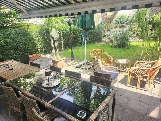 Sehr geschmackvoll und komfortable möblierte Atelier-Wohnung. Großzügiger Wohnraum mit Essbereich. Schlafzimmer mit Doppelbett. Separater Eingang. 6m-Glasfront (Schiebetüren) zur Terrasse. Fußbodenhe...