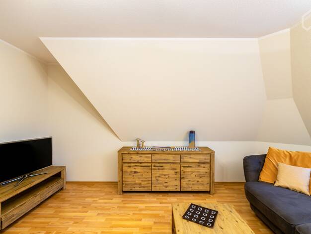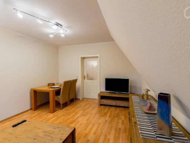 Objektbeschreibung Lichtdurchflutete 2-Zimmer-Wohnung im DG des ruhig gelegenen Wohnhauses. Komplett ausgestattete Küche mit Essplatz, Wohnbereich mit Sofa und TV, Bad mit Dusche. Münzwaschmaschine und -trockner stehen im Haus zur Verfügung. Strompauschale EUR 35.-/Monat (Einzelbelegung) nicht im Mietpreis enthalten. This bright and sunny flat is located on the third floor of the residential building in a leafy and quiet neighbourhood. Living room with sofa, fully equipped kitchen with dining a...
