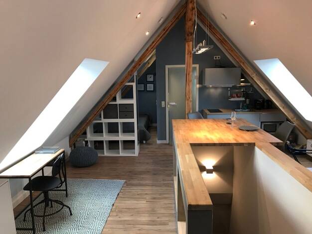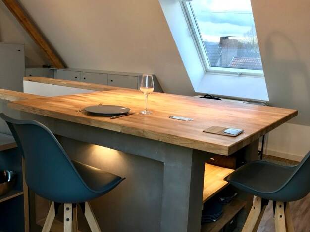 Zwischen Messe und Martinstrasse: Modern gestaltete, mit viel Liebe zum Detail eingerichtete Gästewohnung in Rüttenscheid. Geräumige Wohnküche mit Esstisch für 4 Personen. Küchenblock mit Induktionsh...