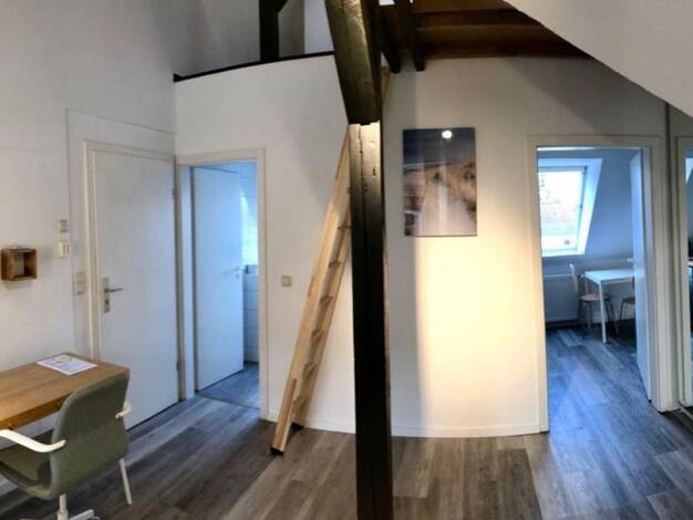 Modern möblierte Etagenwohnung. Dieses Objekt bietet die Möglichkeit der angepassten Möblierung. Die Räume werden zur Zeit als Schlafraum, mit Doppelbett und Arbeitsplatz, sowie als Wohnraum genutzt....